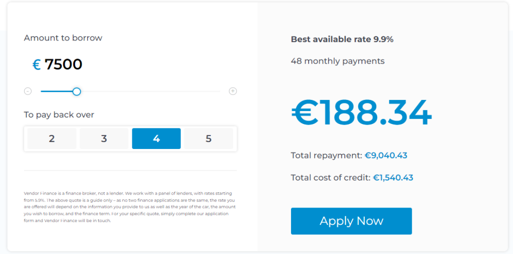Vendor Finance is a finance broker, not a lender. We work with a panel of lenders, with rates starting from 6.9 %. The above quote is a guide only – as no two finance applications are the same, the rate you are offered will depend on the information you provide to us as well as the year of the car, the amount you wish to borrow, and the finance term. For your specific quote, simply complete our application form and Vendor Finance will be in touch.